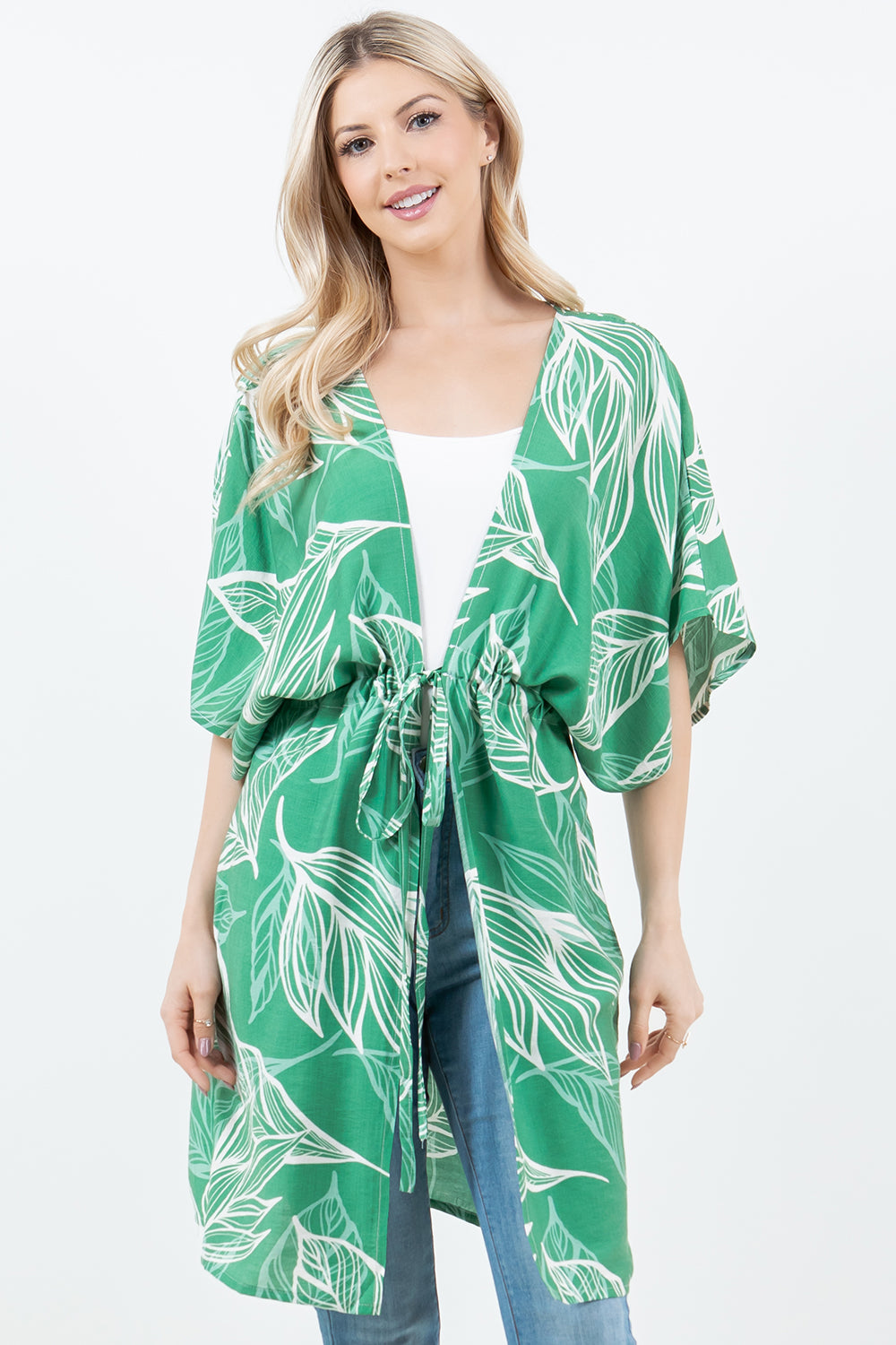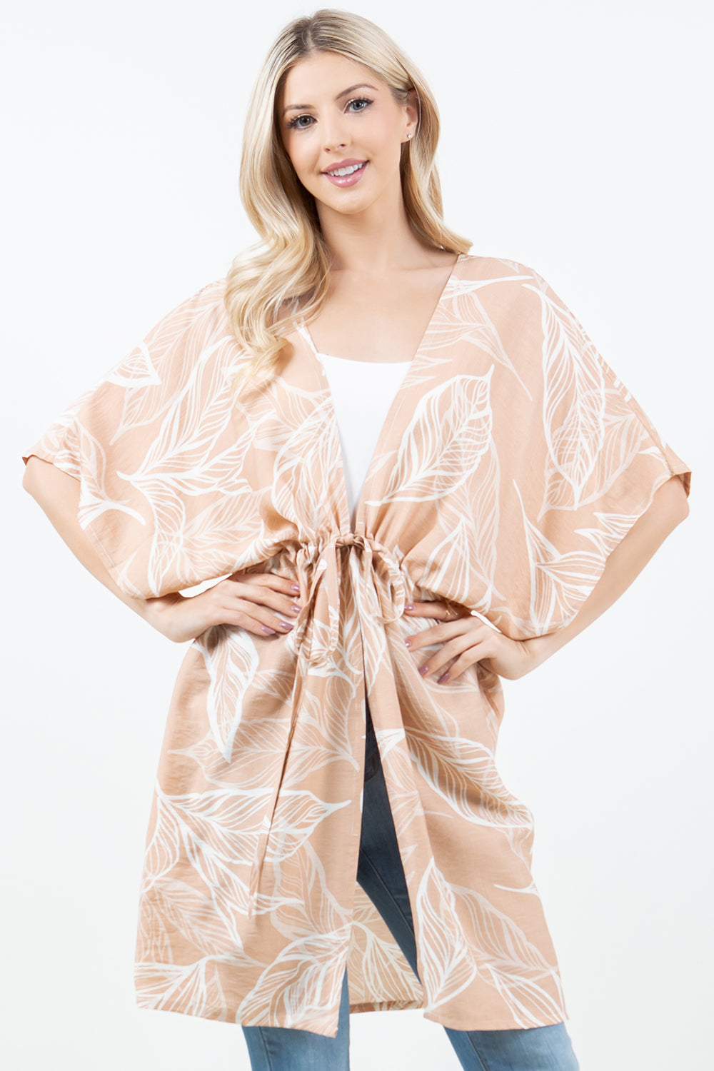 Introducing the KP-5515, a kimono designed with a unique leafy pattern and convenient front ties. This wearable piece is perfect for adding a touch of nature to any outfit. Enjoy the comfort of a kimono with the modern style of a leafy design.